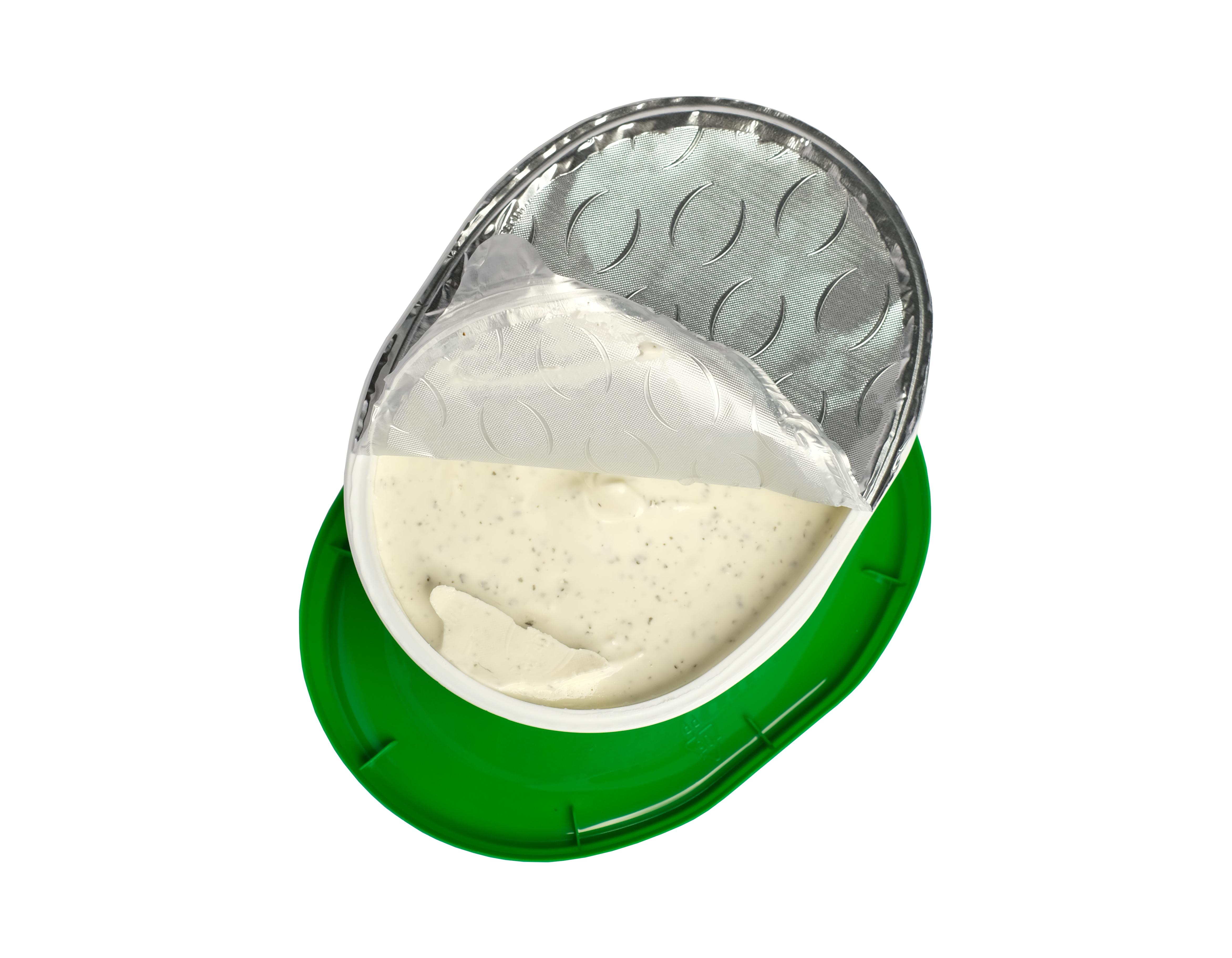 Mystery White Sauce Possibly Ranch Plastic Or Chive Cream Cheese Container With Foil Film Green Lid Looks Unused